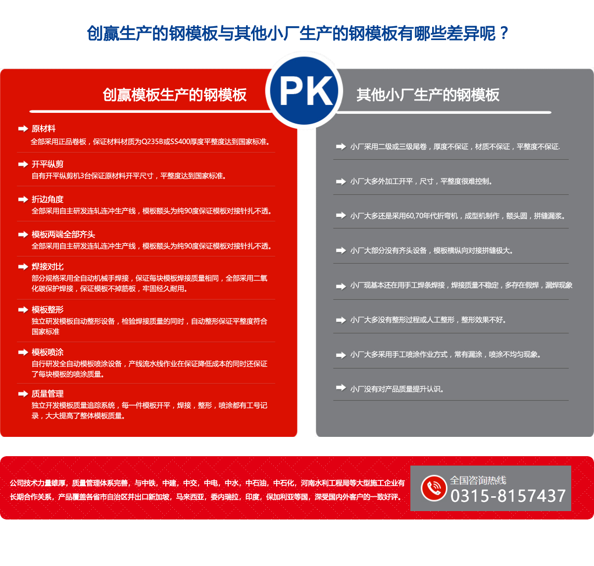 唐山創(chuàng)贏模板有限公司(原唐山豐南雙贏金屬結構廠)始建于一九九七年,是具規(guī)模實力的組合模板生產(chǎn)企業(yè),公司自行設計制造的十二條上卷,連軋,連沖,整形,機械人焊接,調直,噴漆,打包鋼模板生產(chǎn),實現(xiàn)了自動化一條龍生產(chǎn),品質優(yōu),效率高,規(guī)格型號為:寬度100-1200mm, 長度300-3000mm, 板厚1.8-4.0mm。